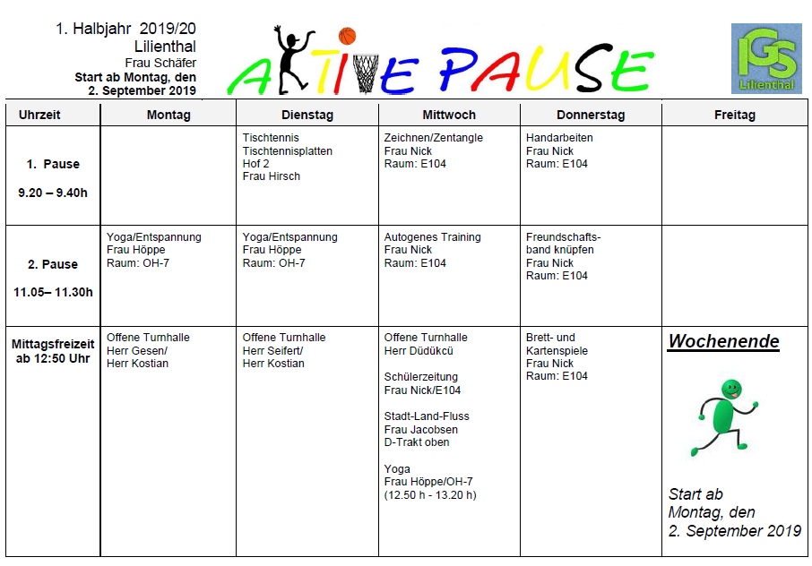 Um den Schülerinnen und Schülern eine erholsame und gleichzeitig aktive Pause zu ermöglichen, bietet die IGS Lilienthal verschiedene Aktivitäten während der Pausenzeiten an: